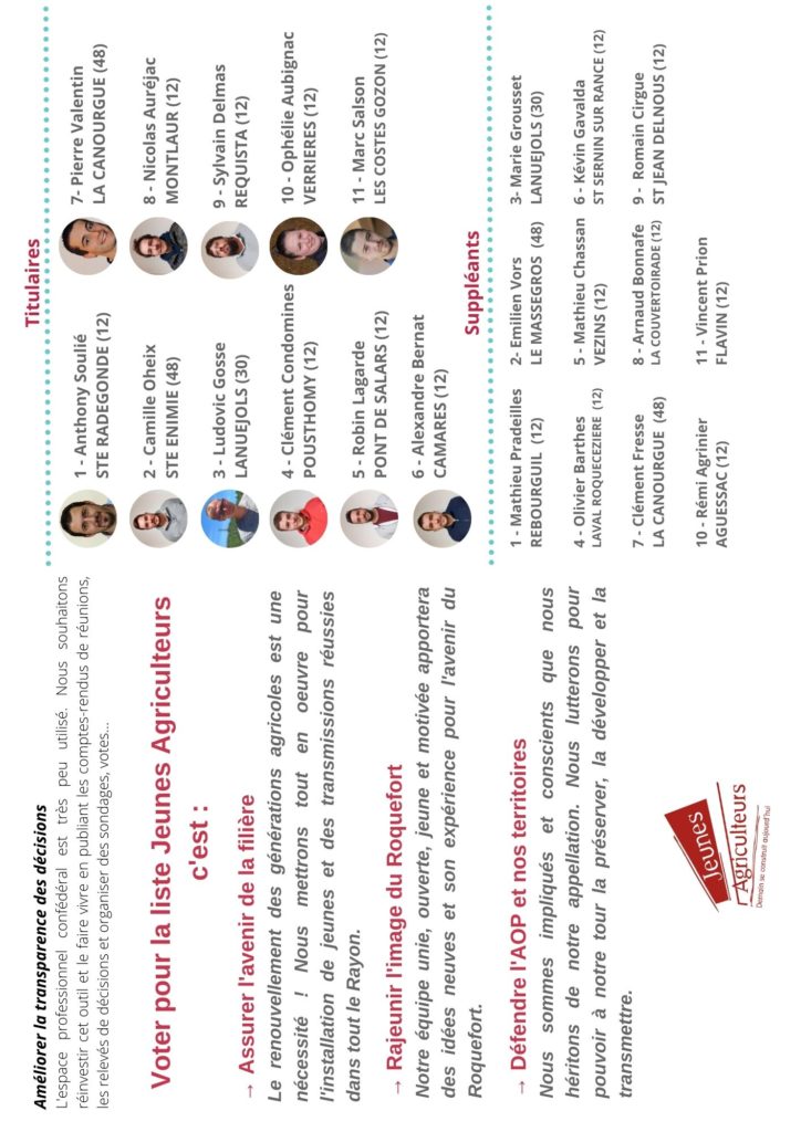L’installation et la transmission sont la priorité des JA qui visent l’objectif d’une installation pour un départ. Pour y parvenir, ils comptent renforcer la connaissance du métier, par la formation et la communication. Ils souhaitent par exemple doubler le budget de communication et communiquer sur tous les fronts : événements, réseaux sociaux, en faisant des visites de fermes auprès des scolaires, des étudiants, mais également des touristes et profiter de l’attractivité touristique du territoire pour faire connaître leur production. Enfin, la défense de l’AOP Roquefort trouve sa place dans la profession de foi. La liste entend entre autre faire évoluer le cahier des charges pour l’adapter aux réalités sociale et économique.